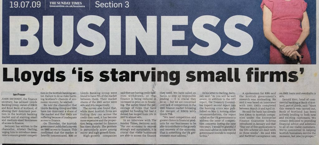 In an interview with the Sunday Times, Swinney said: “For our economy to recover strongly and sustainably, it is crucial that viable businesses are able to access the finance they need. We have called on banks to step up responsible lending – it is crucial they do so – but we are concerned over lack of competition in the SME finance market following the merger of HBOS with Lloyds TSB.”
